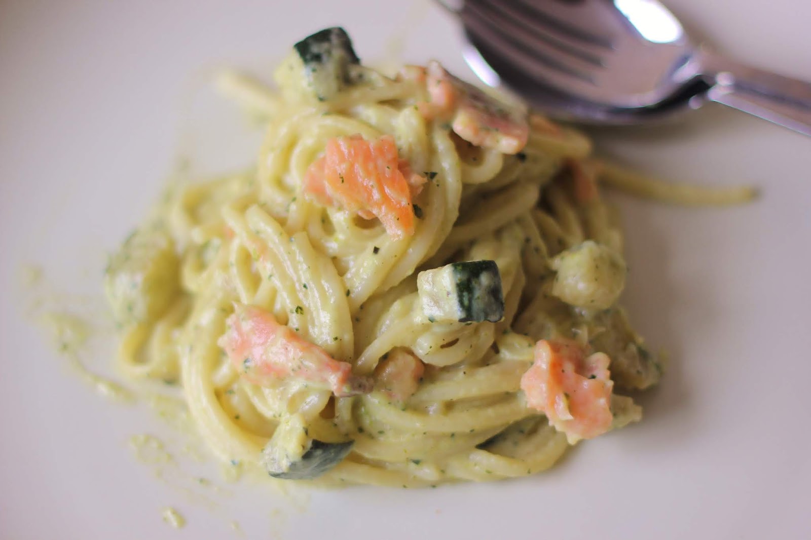 Esas viaxes polas redes, esas viaxes por Instagram. Foi ver esta receita nun vídeo de IG e non poder quitarma da cabeza. Ata que sen querer, un día calquera de semana, de repente e sen planificar, vinme facéndoa. Non me puido gustar máis e xa case ao rematar senteime frente ao ordenador para redactala, para repetila máis veces. E non só iso, senón que se me están ocurrindo un montón de variantes que estou desexando poñer en práctica. Usar outras verduras para facer a salsa: espinacas, cogomelos... No canto de salmón: langostinos, gambas, beicon, sobras de carne de outra comida... Posibilidades infinitas e todas me parecen gustosas e moi apetecibles.