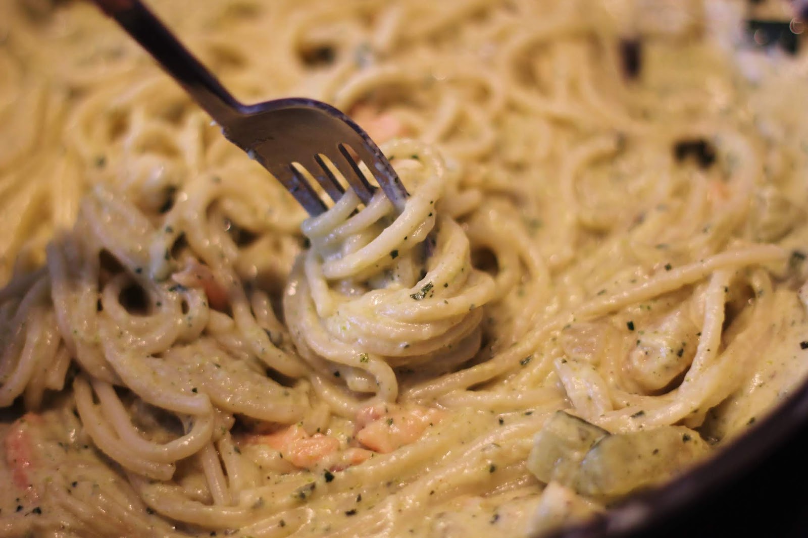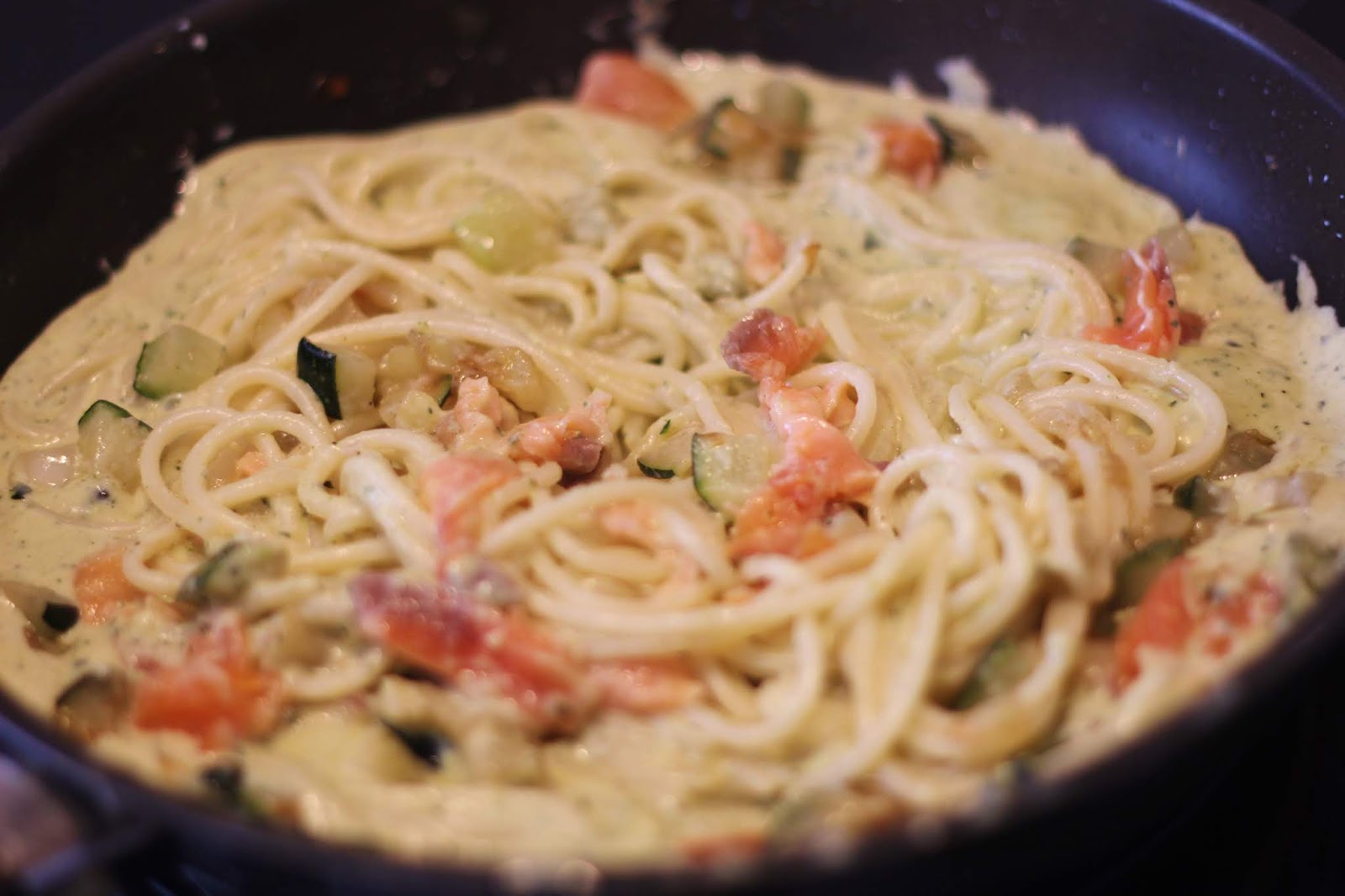 - Por último, juntamos todo en la sartén: la salsa, los espaguetis, el salmón cortado en trozos pequeños y los tacos de calabacín que teníamos reservados. Si vemos que queda muy compacto podemos añadir algo del agua de cocer los espaguetis. Mezclamos bien y listo de comer.